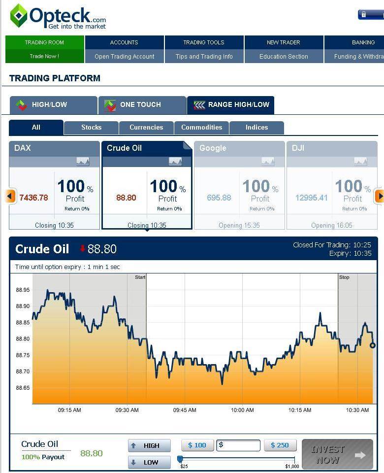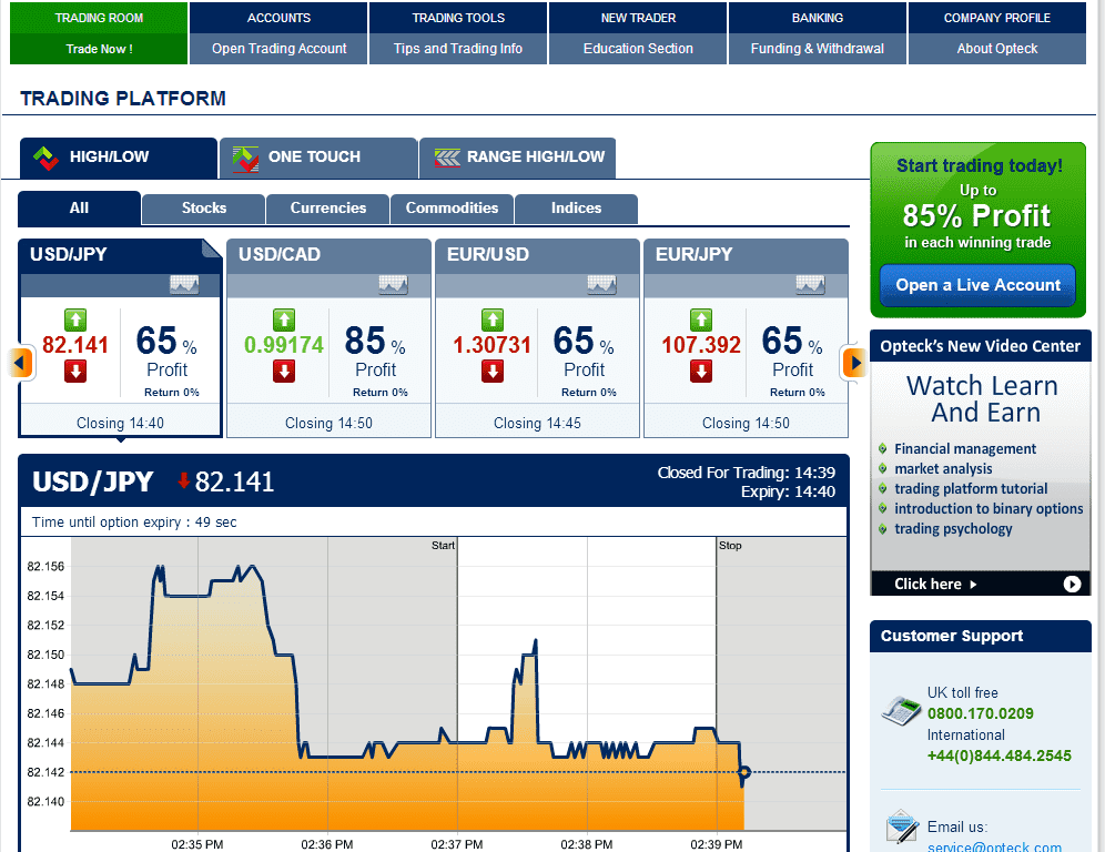 資産の選択肢を見てみると、Opteckは約50資産で他のバイナリブローカーに比べて多少限定された取引になる。それらはすべてのハイライトを打つので、バイナリトレーダーの大半には十分であると思われます。資産の選択肢は6キー通貨や南アフリカのランドの主要なペアが含まれています。商品リストにはOIL、銀、金と同様に、トウモロコシ、コーヒーが含まれています。株式やインデックス取引に興味があるバイナリのトレーダーの場合の選択肢は薄型であり、主要インデックス取引は、ウォールストリートのDJ30、S&P500とナスダック、プラスフランスCAC40、ドイツDAX30と日本の日経が含まれています。英国に本社を置く同社の注目すべきオプションとしてFTSEを提供していません。
